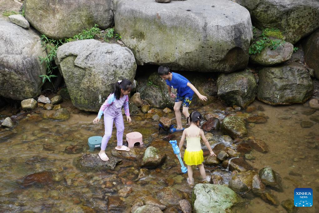 Tourists play in a stream in Nanping Village, Taiping Town, Nanchang City of east China's Jiangxi Province, Aug. 1, 2025.