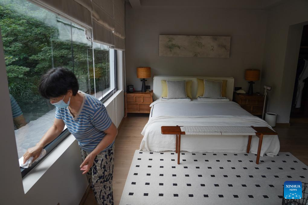 A staff member cleans a room at a homestay in Nanping Village, Taiping Town, Nanchang City of east China's Jiangxi Province, Aug. 1, 2025.