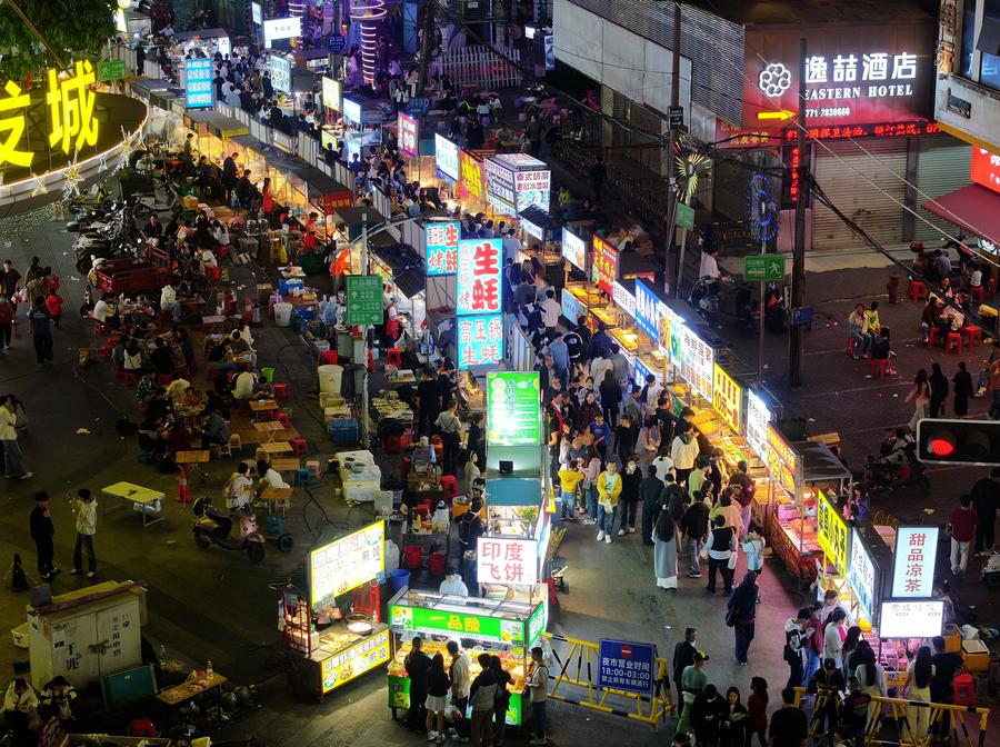 An aerial drone photo taken on May 20, 2025 shows the Xiguan night market in Nanning, south China's Guangxi Zhuang Autonomous Region. Various night fairs and booths across the city have boosted consumption and injected vitality into the city's night economy. (Xinhua/Huang Xiaobang)