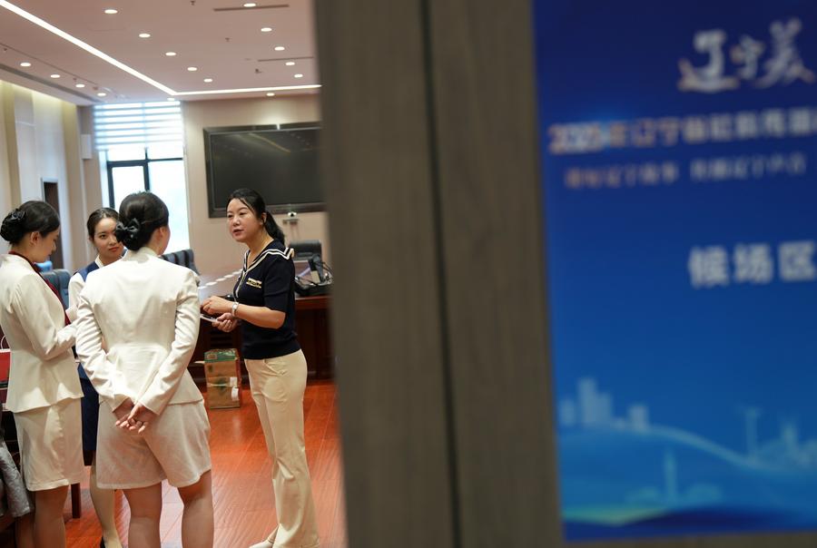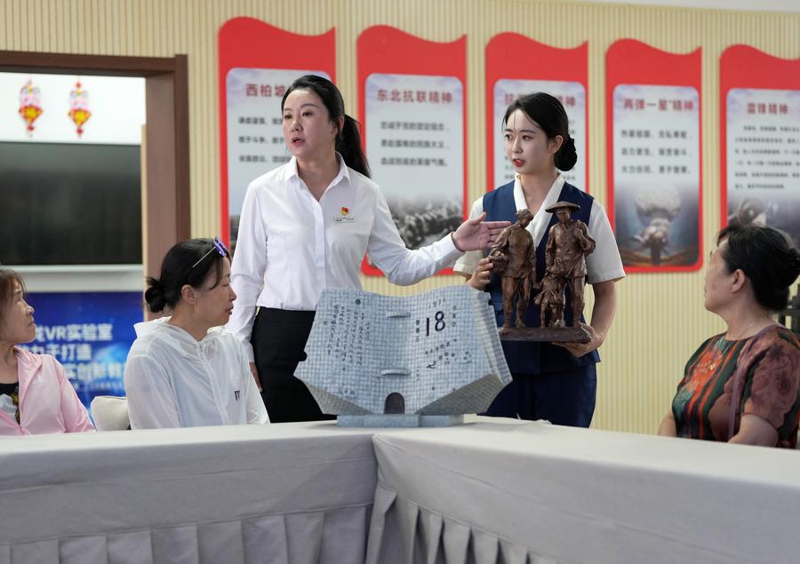 Shi Renhua (1st R) instructs docents attending a speech contest in Dadong District of Shenyang, northeast China's Liaoning Province, July 22, 2025. (Xinhua/Li Gang)