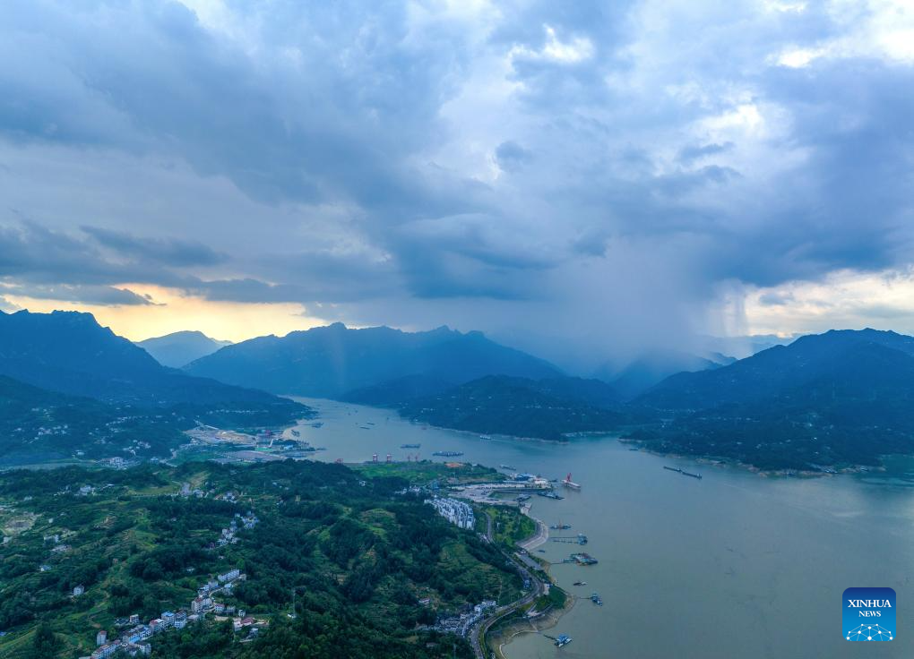 An aerial drone photo shows a "clear sky in the east and rain in the west" phenomenon in the Three Gorges dam area on the Yangtze River near Zigui county of central China's Hubei Province, July 28, 2025. (Photo by Wang Gang/Xinhua)