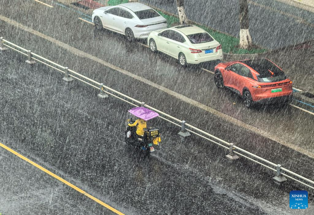 A deliveryman rides in rain in Chuanshan District, Suining City, southwest China's Sichuan Province, July 23, 2025. (Photo by Liu Changsong/Xinhua)