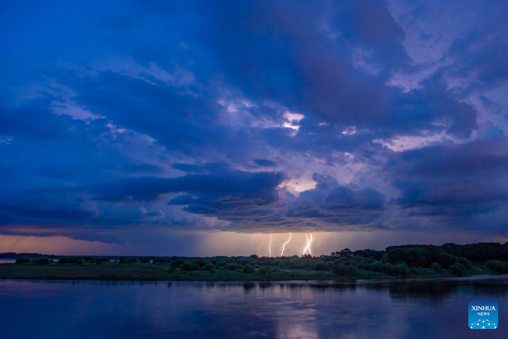 Cumulonimbus clouds and lightning are pictured in Jiayin County, Yichun City, northeast China's Heilongjiang Province, July 21, 2025. (Photo by Li Shaojun/Xinhua)
