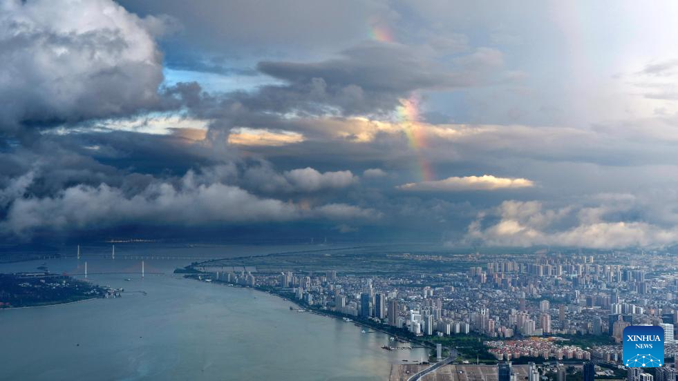 An aerial drone photo taken on July 30, 2025 shows a rainbow above Shantou City, south China's Guangdong Province. (Photo by Yao Jun/Xinhua)