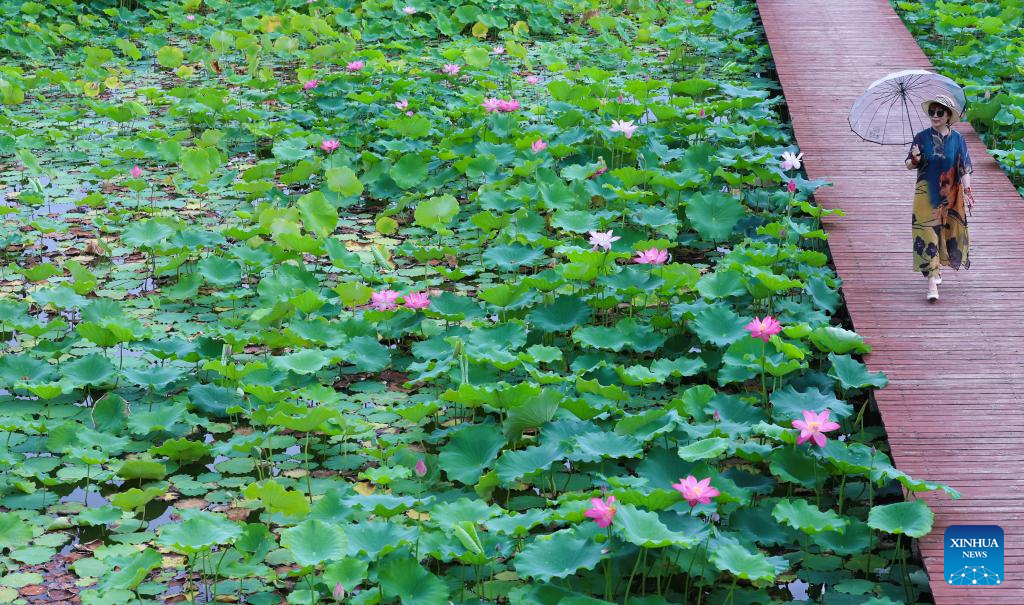 A tourist enjoys the scenery of lotus flowers at a botanical garden in Shijiazhuang, north China's Hebei Province, July 7, 2025. (Photo by Liang Zidong/Xinhua)