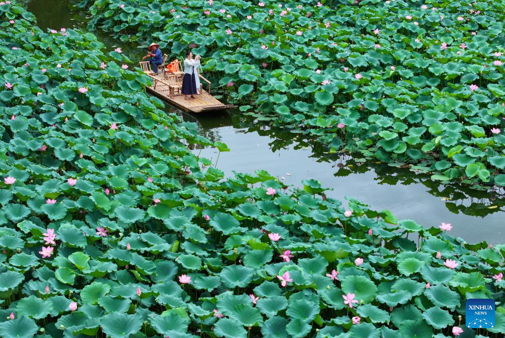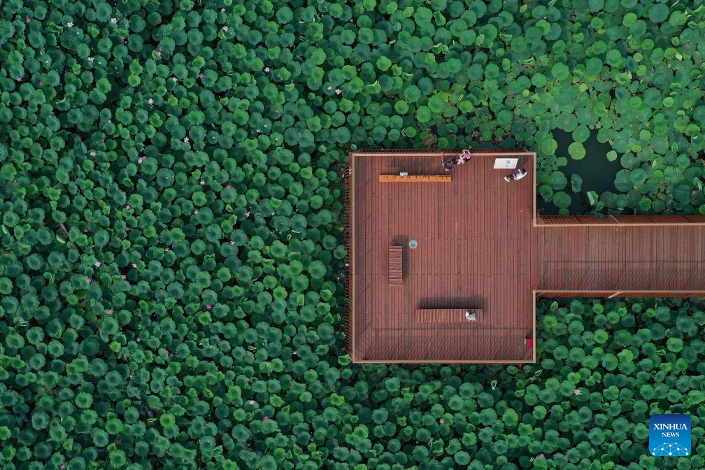 An aerial drone photo taken on July 10, 2025 shows people enjoying lotus flowers in Xuanwu Lake in Nanjing, east China's Jiangsu Province. (Photo by Xin Yi/Xinhua)