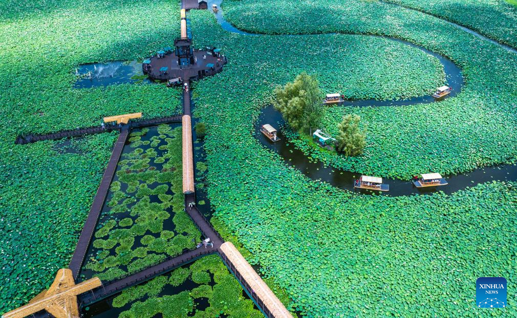 An aerial drone photo taken on July 21, 2025 shows a view of a lotus pond scenic area in Xinghua City, east China's Jiangsu Province. (Photo by Zhou Shegen/Xinhua)