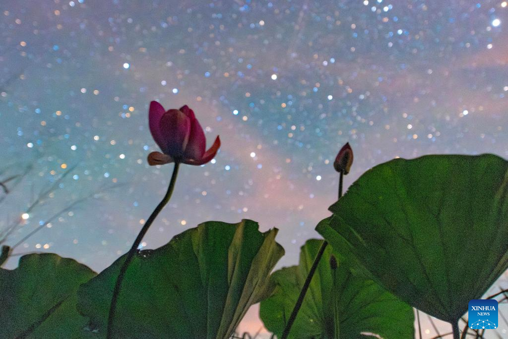 This photo taken on Aug. 4, 2025 shows lotus flowers under the starry night at Sanhuanpao National Nature Reserve, in Fujin City, northeast China's Heilongjiang Province. (Photo by Qu Yubao/Xinhua)