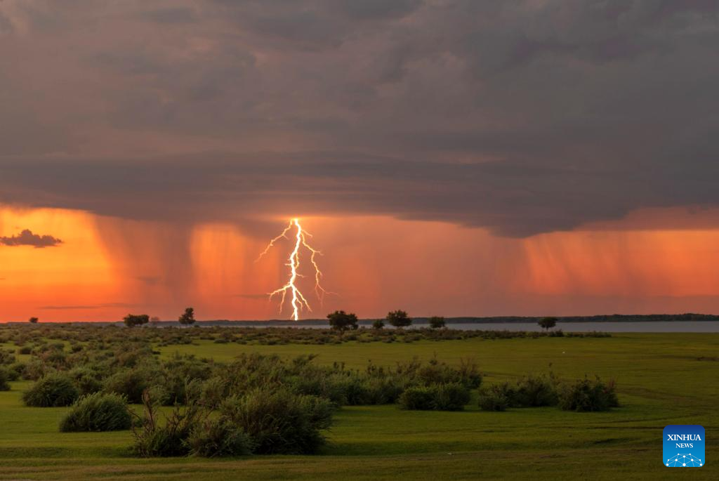 Thunderstorm and lightning are pictured on July 21, 2025 in Mongolian Autonomous County of Dorbod in Daqing City, northeast China's Heilongjiang Province. (Photo by Liu Wei/Xinhua)