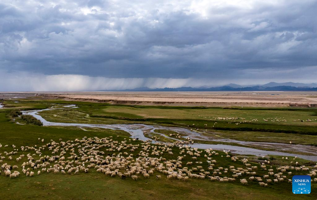 An aerial drone photo shows sheep grazing in the summer pasture while rain falling in the distance in the Kazak Autonomous County of Aksay, northwest China's Gansu Province, July 12, 2025. (Photo by Gao Hongshan/Xinhua)