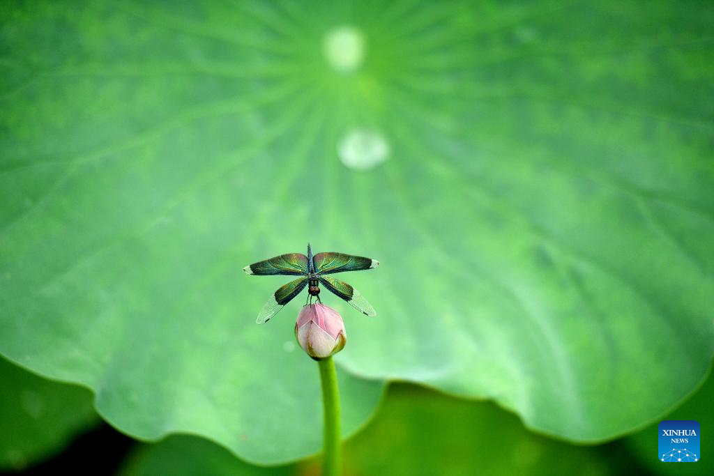 A dragonfly rests on a lotus flower at Shicheng Park in Cangzhou City, north China's Hebei Province, July 1, 2025. (Photo by Yuan Liwei/Xinhua)
