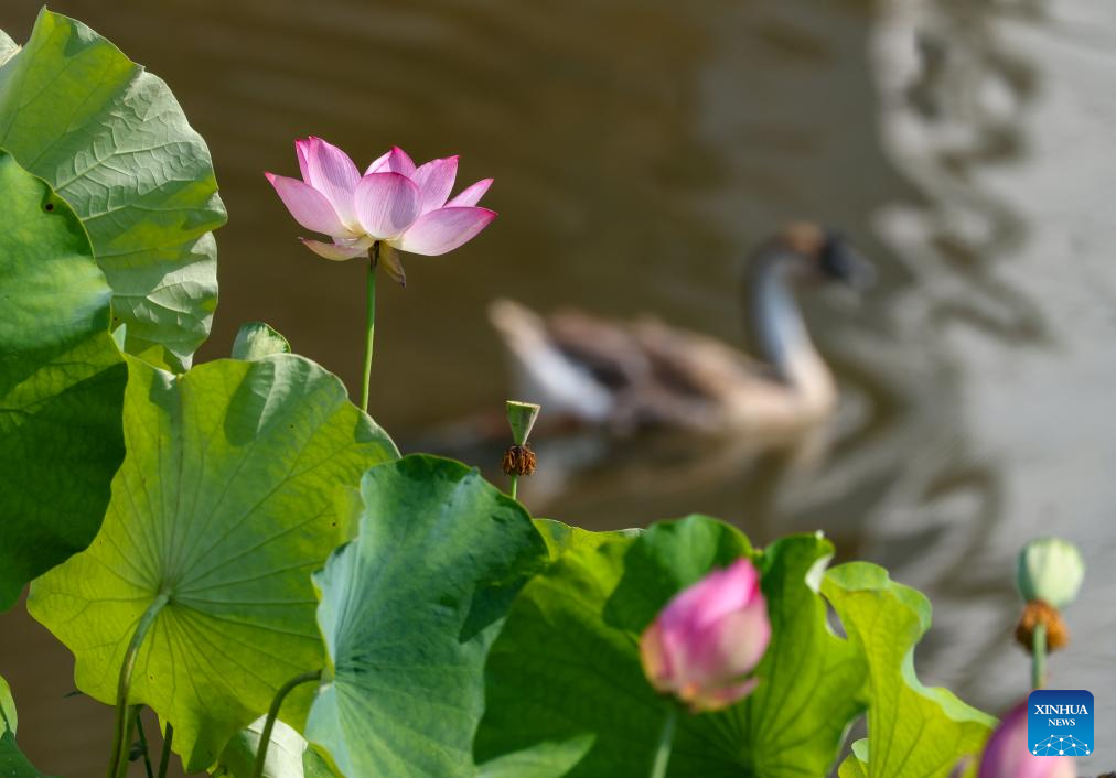 A goose passes lotus flowers in Paomulong Village of Zaojiaoping Subdistrict in Yuping, southwest China's Guizhou Province, July 7, 2025. (Photo by Hu Panxue/Xinhua)