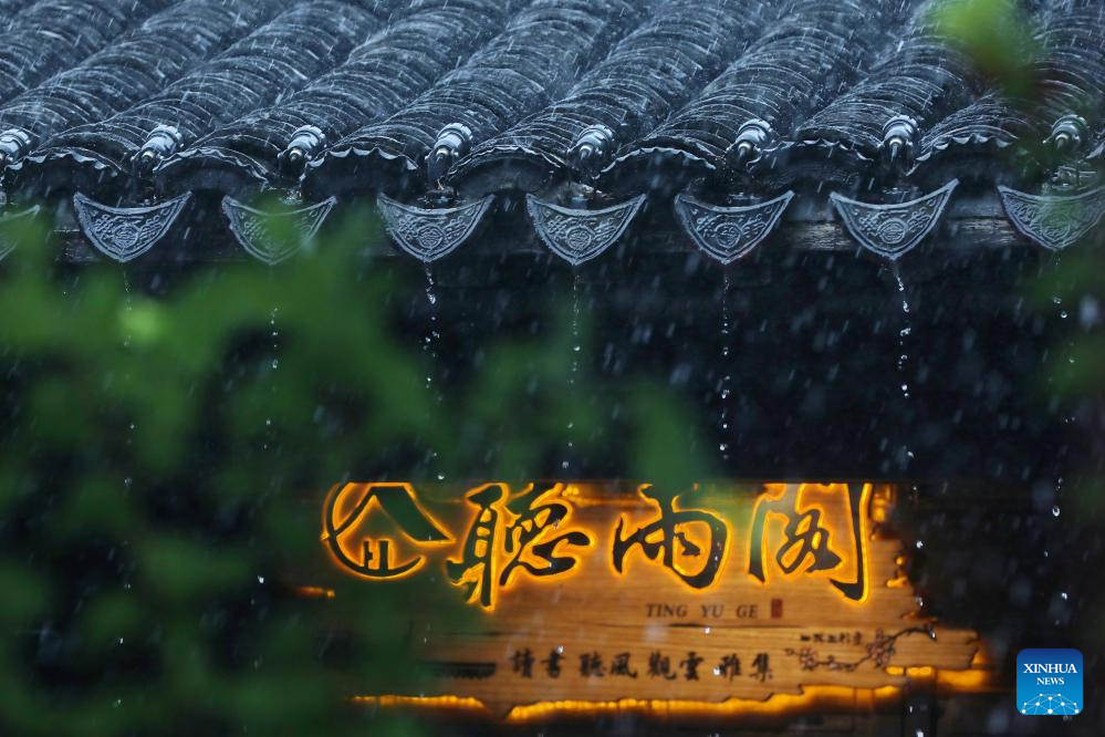 This photo shows a view in rain in Nanhu Lake scenic area in Jiaxing City, east China's Zhejiang Province, July 8, 2025. (Photo by Jin Peng/Xinhua)