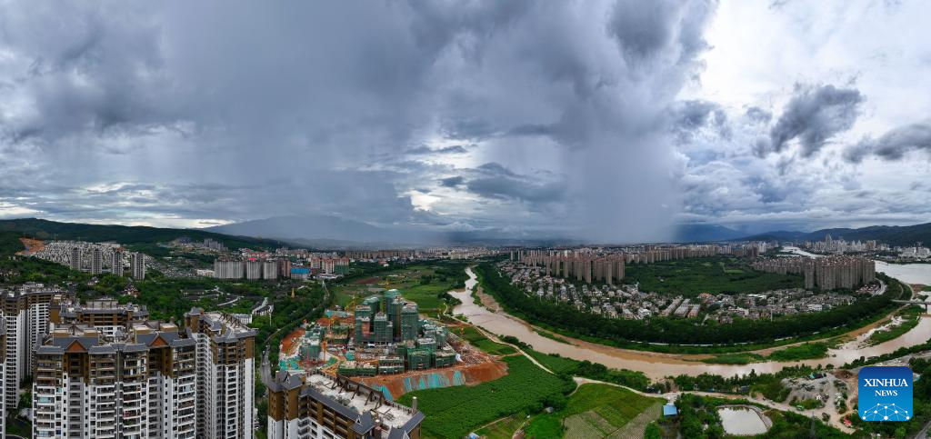 An aerial panoramic photo shows the city view in the rain in Jinghong City, Xishuangbanna Dai Autonomous Prefecture, southwest China's Yunnan Province, July 7, 2025. (Photo by Li Yunsheng/Xinhua)
