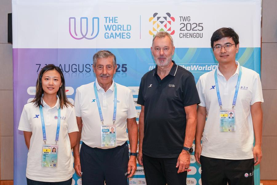 International World Games Association (IWGA) President Jose Perurena Lopez (2nd L) and IWGA CEO Joachim Gossow (2nd R) speak with Xinhua reporters in Chengdu, southwest China's Sichuan Province, on August 5, 2025. (Xinhua/Li Bo)
