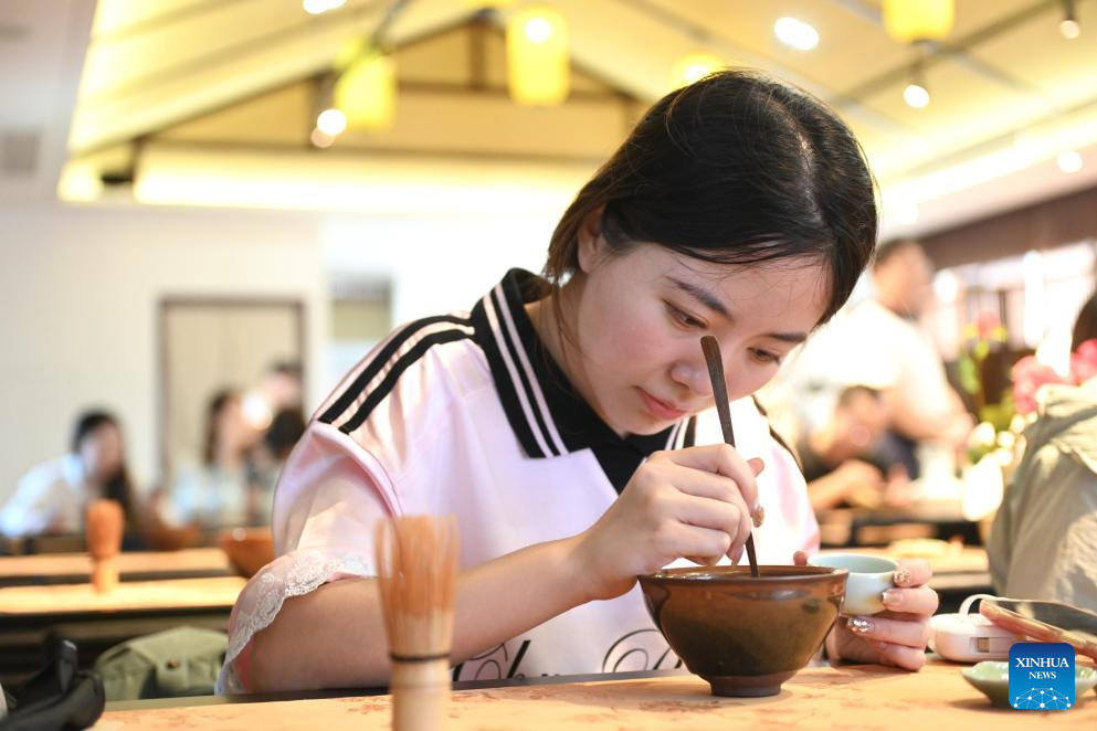 A tourist tries a traditional Chinese tea-making technique at Jingshan Village in Yuhang District of Hangzhou City, east China's Zhejiang Province, Aug. 5, 2025. Jingshan Village, located in Yuhang District of Hangzhou City, east China's Zhejiang Province, is celebrated for its top-notch forest coverage rate of over 96 percent.