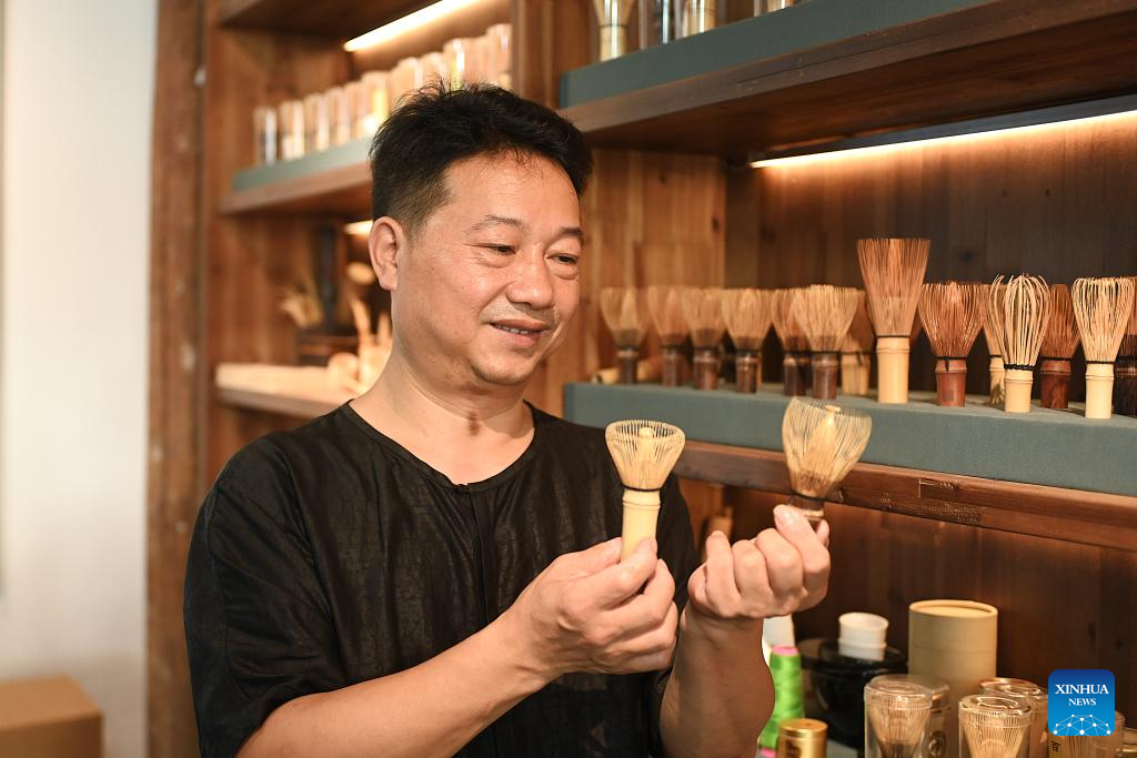 Chen Jinxin, an inheritor of tea whisk making technique, shows handmade tea whisks at Jingshan Village in Yuhang District of Hangzhou City, east China's Zhejiang Province, Aug. 5, 2025. Jingshan Village, located in Yuhang District of Hangzhou City, east China's Zhejiang Province, is celebrated for its top-notch forest coverage rate of over 96 percent.