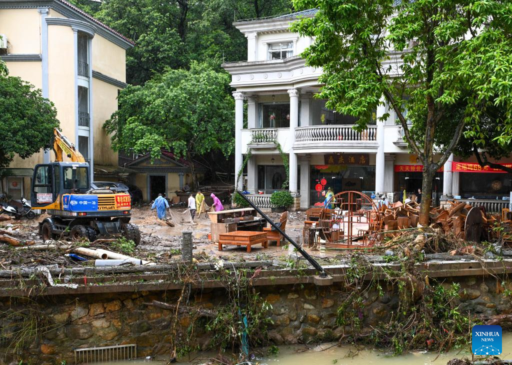 Villagers move flood-damaged furniture in Huanghua Village of Qingyuan City, south China's Guangdong Province, Aug. 6, 2025. China's national commission for disaster prevention, reduction and relief on Wednesday initiated a Level-IV emergency response in Guangdong Province due to heavy rainfall and severe flooding, according to the Ministry of Emergency Management. The southern province has been experiencing heavy rain since the beginning of the week, with the provincial meteorological observatory alarming about geological disasters, urban waterlogging and mountain torrents. (Xinhua/Xiao Ennan)