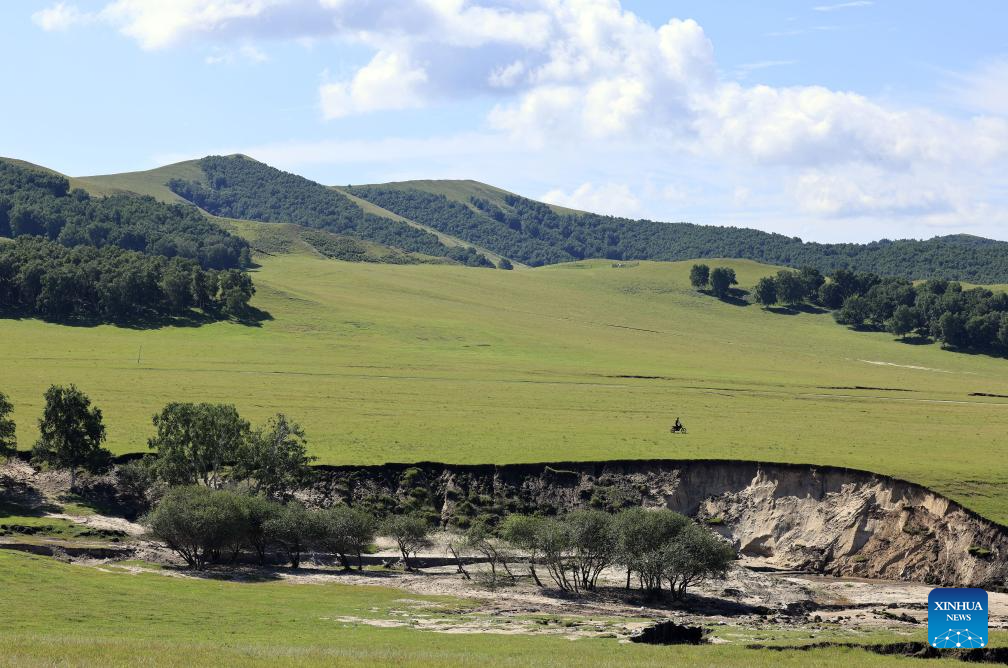 This photo taken on Aug. 7, 2025 shows a view of the Ulan Butong grassland in Hexigten Banner of Chifeng, north China's Inner Mongolia Autonomous Region. Rich in natural tourism resources, the Ulan Butong scenic area features lakes, grasslands, and forests, attracting numerous visitors. (Xinhua/Jia Lijun)
