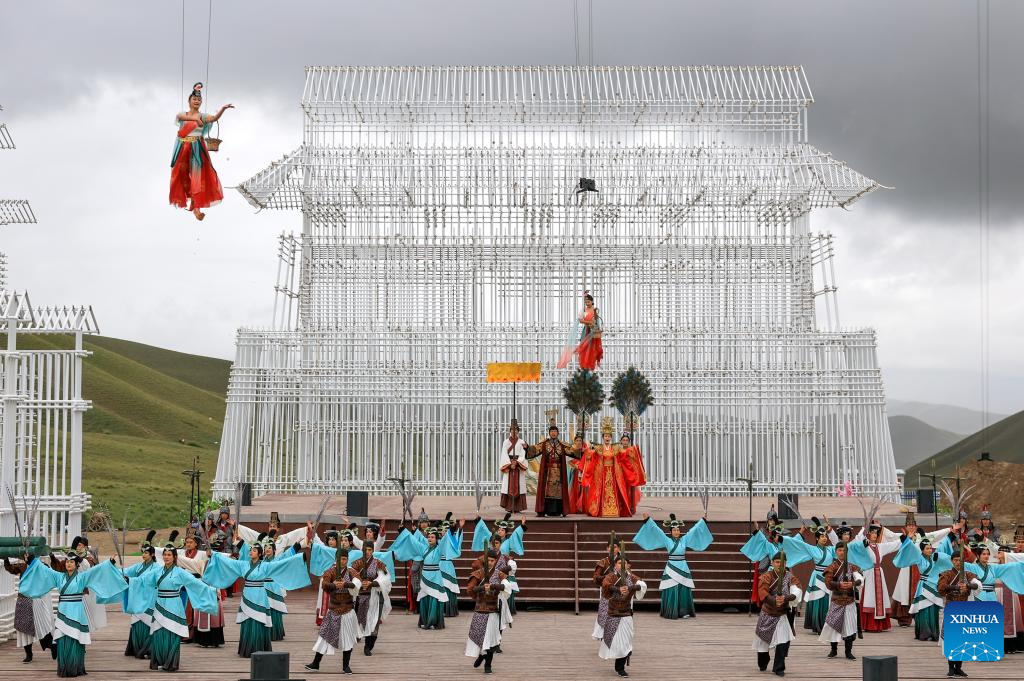 Artists perform drama at Kunlun Mountains scenic area in Qira County, northwest China's Xinjiang Uygur Autonomous Region, Aug. 6, 2025. Known for its unique natural beauty and rich cultural heritage, Kunlun Mountains scenic area has attracted numerous visitors during summer vacation. (Xinhua/Wang Fei)