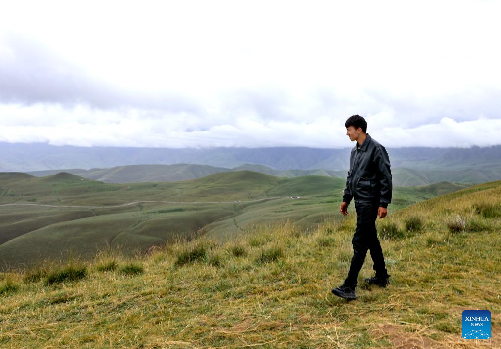 A staff member patrols at Kunlun Mountains scenic area in Qira County, northwest China's Xinjiang Uygur Autonomous Region, Aug. 6, 2025. Known for its unique natural beauty and rich cultural heritage, Kunlun Mountains scenic area has attracted numerous visitors during summer vacation. (Xinhua/Cai Guodong)