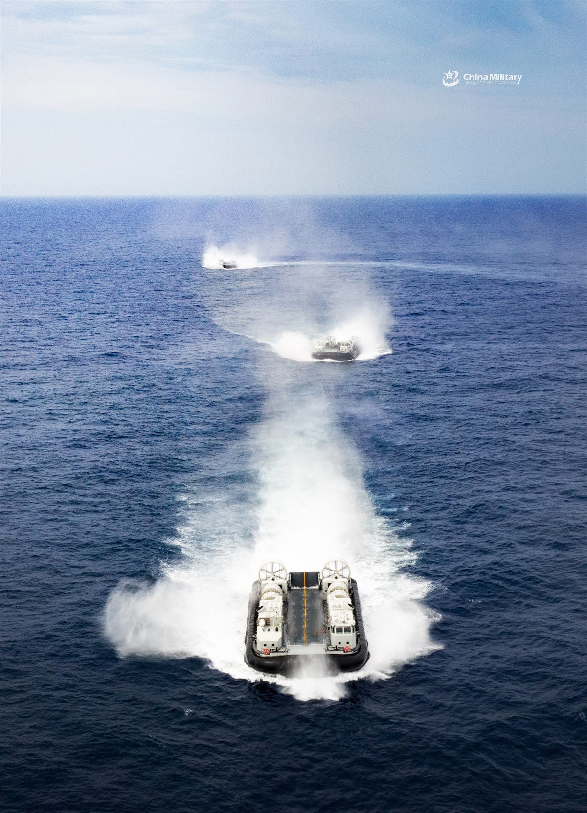 Landing craft air cushions (LCACs) attached to a landing ship group with the navy under the Chinese PLA Southern Theater Command steam in line formation to the beachhead at lightning speed during a maritime training exercise in summer day. (eng.chinamil.com.cn/Photo by Zhang Xueyan)