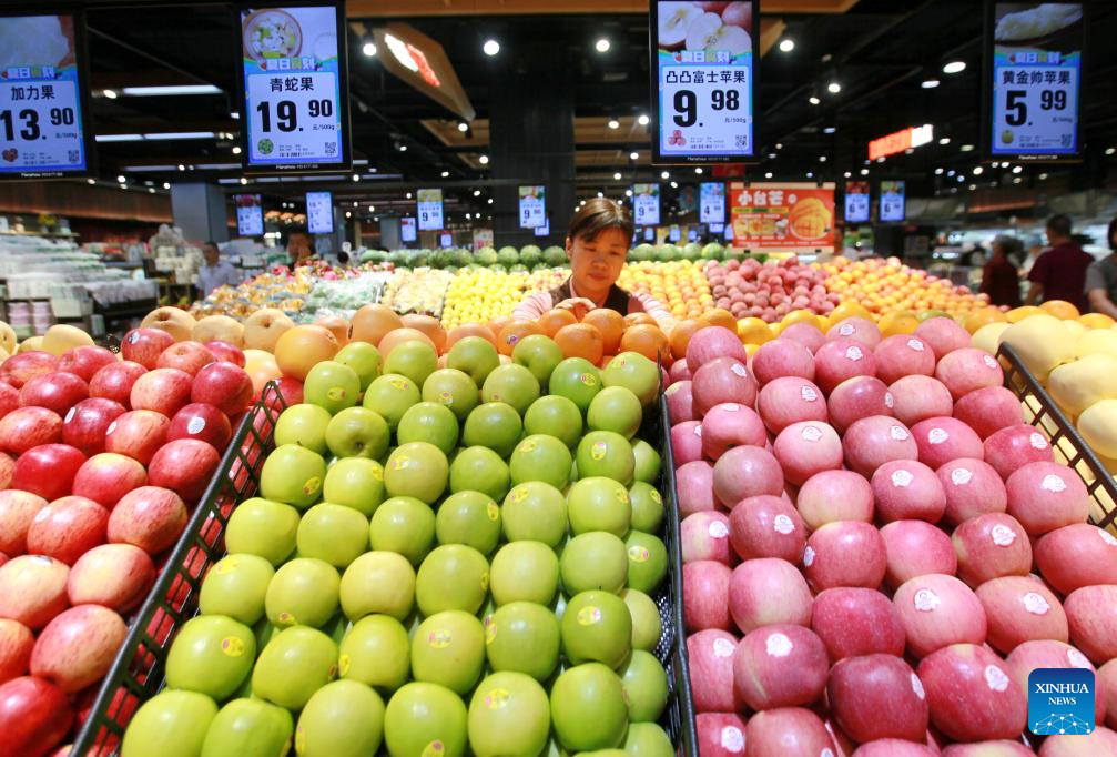 A woman buys fruits at a supermarket in Qingzhou City, east China's Shandong Province, Aug. 9, 2025. China's consumer price index (CPI), a main gauge of inflation, climbed 0.4 percent in July compared with the previous month, reversing a 0.1-percent drop in June and exceeding the average seasonal pace of 0.3 percent, data from the National Bureau of Statistics (NBS) showed Saturday. (Photo by Wang Jilin/Xinhua)