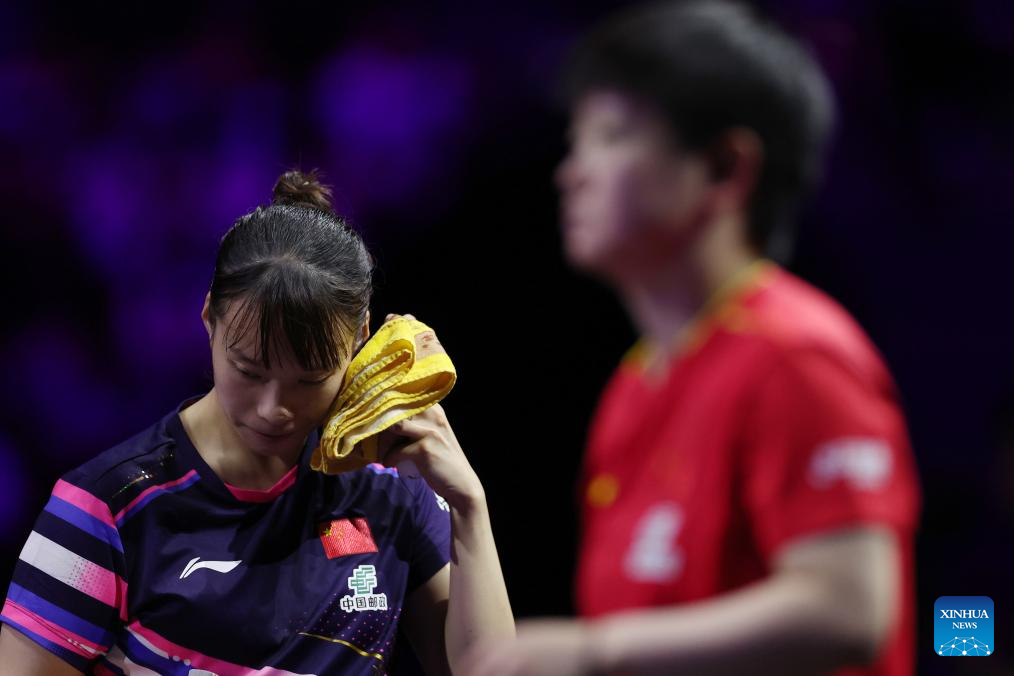 Shi Xunyao (L) of China wipes her face during the women's singles semifinal match between Sun Yingsha of China and Shi Xunyao of China at the WTT Champions Yokohama 2025 in Yokohama, Japan, Aug. 11, 2025. (Xinhua/Jia Haocheng)
