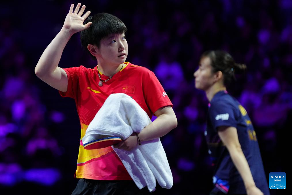 Sun Yingsha (L) of China greets the spectators after the women's singles semifinal match between Sun Yingsha of China and Shi Xunyao of China at the WTT Champions Yokohama 2025 in Yokohama, Japan, Aug. 11, 2025. (Xinhua/Jia Haocheng)