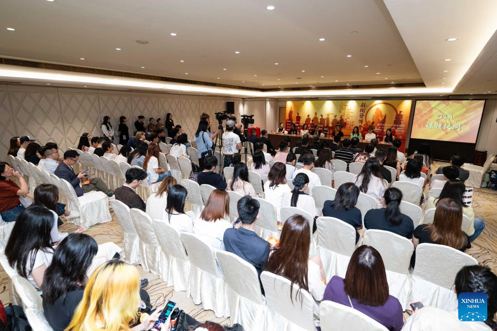 This photo taken on Aug. 11, 2025 shows a scene of a press conference for the original folk dance drama "Dream of the Red Mansions" held in Macao, south China. The drama, produced by Jiangsu Center for the Performing Arts, will be staged at the Macao Cultural Centre in Macao from Aug. 15 to 17.