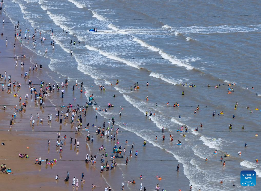 An aerial drone photo taken on Aug. 12, 2025 shows tourists having fun on a beach at the Nansha scenic area in Zhujiajian, Zhoushan City, east China's Zhejiang Province. As Nansha scenic area ushered in the summer tourism peak, seaside activities like sand sculpture festival, music party, night swimming, sailing and fireworks show attracted tourists from around the country. (Xinhua/Xu Yu)