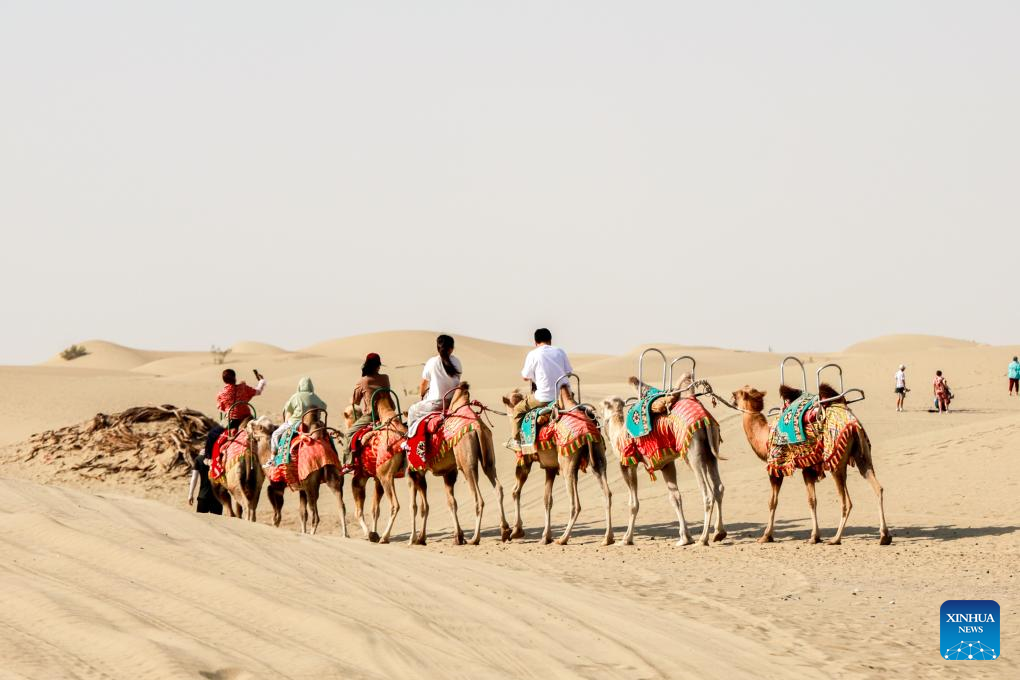 Tourists ride camels at the "desert gate" scenic area in Alaer, northwest China's Xinjiang Uygur Autonomous Region, Aug. 12, 2025. The "desert gate" scenic area, covering an area of 14 hectares, receives an average of 600,000 visits annually. (Xinhua/Liu Jiaqi)