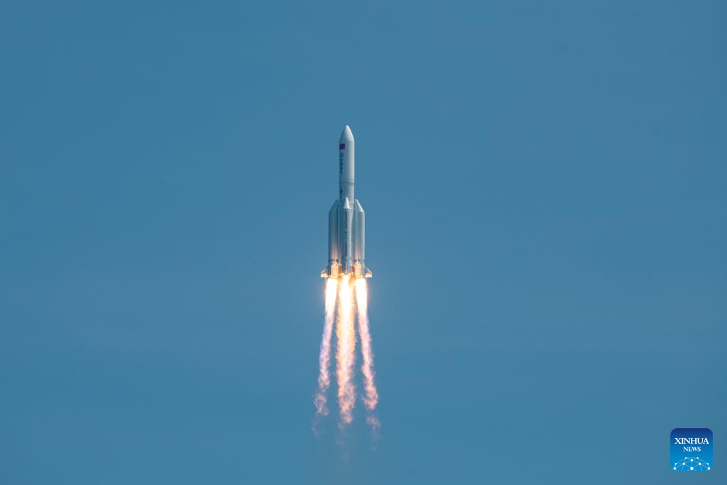 A Long March-5B carrier rocket carrying a group of low Earth orbit satellites blasts off from the Wenchang Space Launch Site in south China's Hainan Province, Aug. 13, 2025. This satellite group, the eighth of its kind that will constitute an internet constellation, was launched at 2:43 p.m. (Beijing Time) aboard a Long March-5B carrier rocket, featuring a Yuanzheng-2 (Expedition-2) upper stage at the top of the rocket. (Xinhua/Guo Cheng)