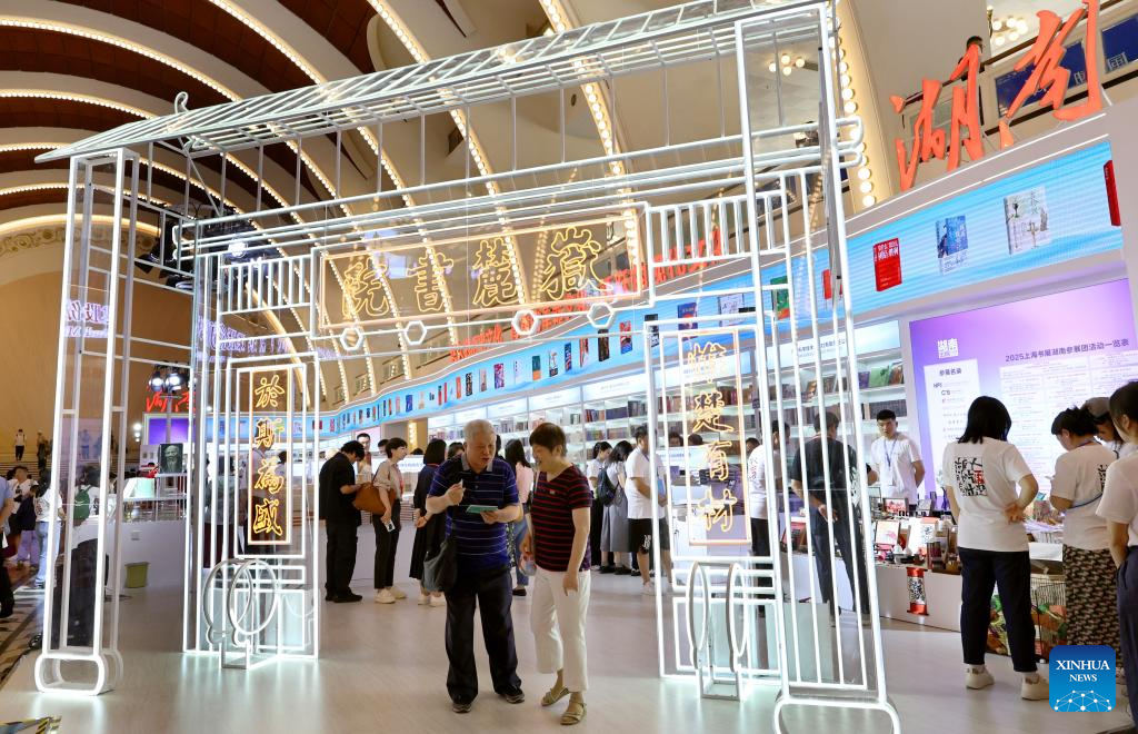 This photo taken on Aug. 13, 2025 shows the pavilion of Hunan Province at the 2025 Shanghai Book Fair in Shanghai, east China. The book fair kicked off on Wednesday and will last until Aug. 19. (Xinhua/Fang Zhe)