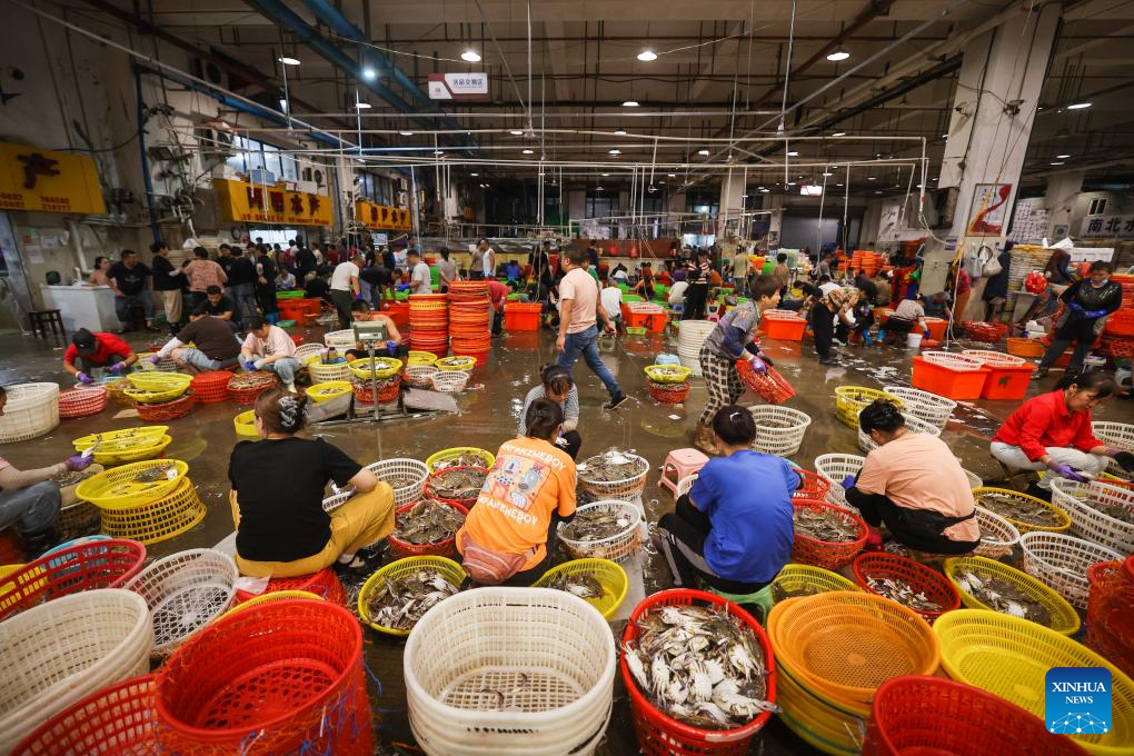 Merchants sort out and bundle up fresh swimming crabs at an aquatic products market in Zhoushan City, east China's Zhejiang Province, Aug. 12, 2025. Fishing vessels with special permission have started fishing operation due to the end of the three-month fishing ban for some areas of the East China Sea. Recently, about 2,000 tonnes of swimming crabs are transported to the port everyday. (Xinhua/Xu Yu)