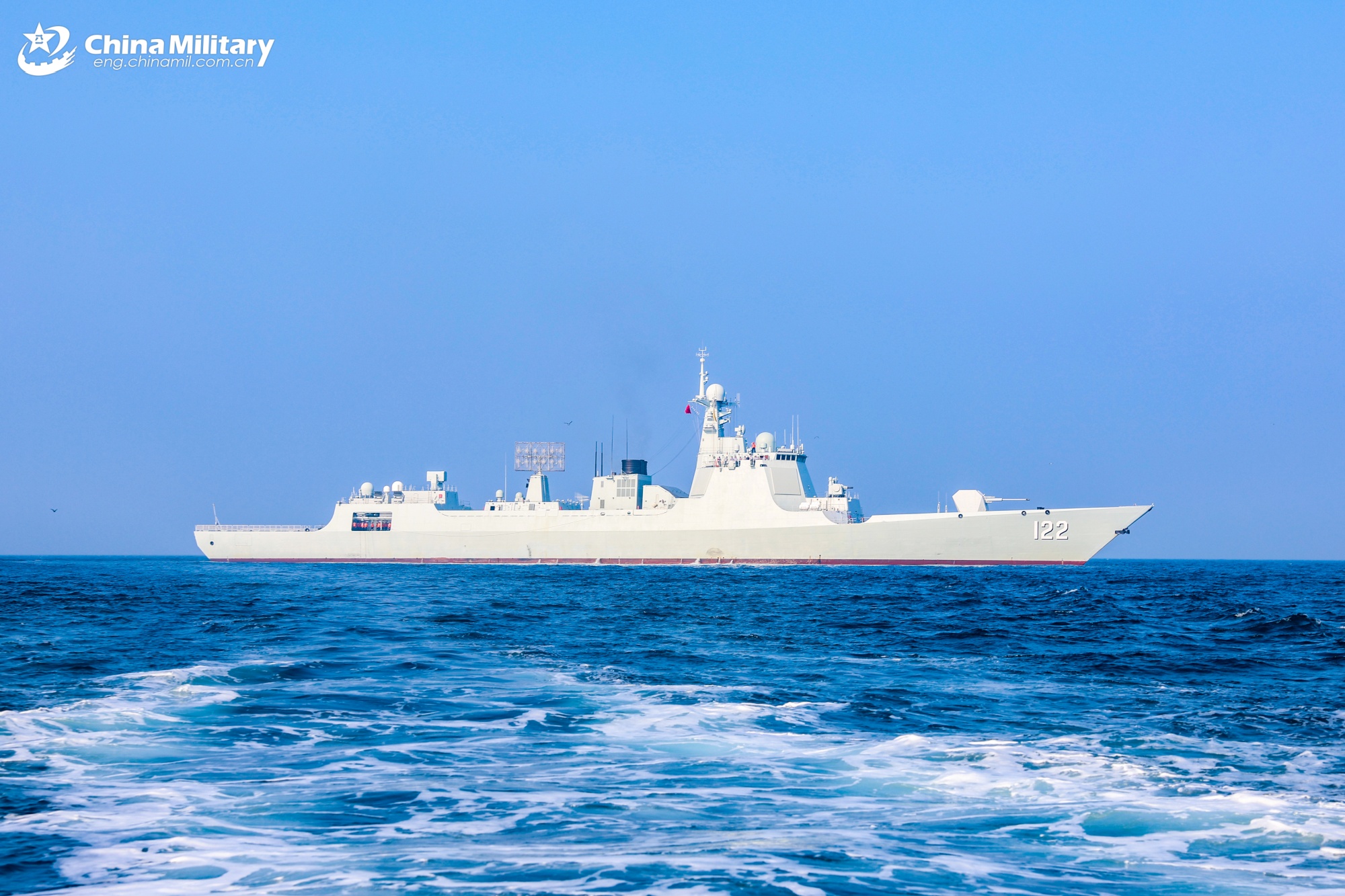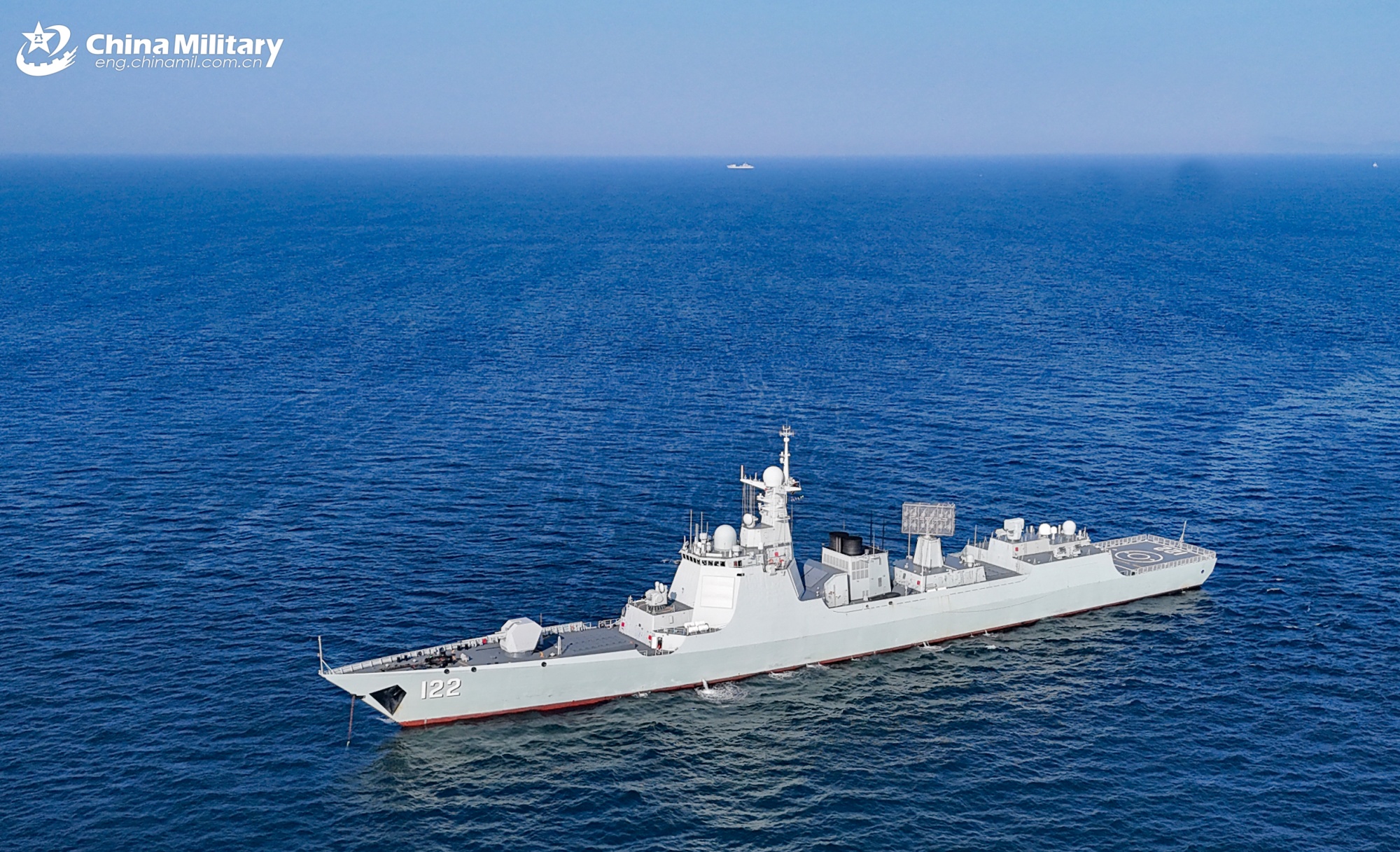 The guided-missile destroyer Tangshan (Hull 122) attached to a flotilla with the navy under the Chinese PLA Northern Theater Command sails on the sea during a maritime training exercise held recently. (eng.chinamil.com.cn/Photo by Ma Yubin)