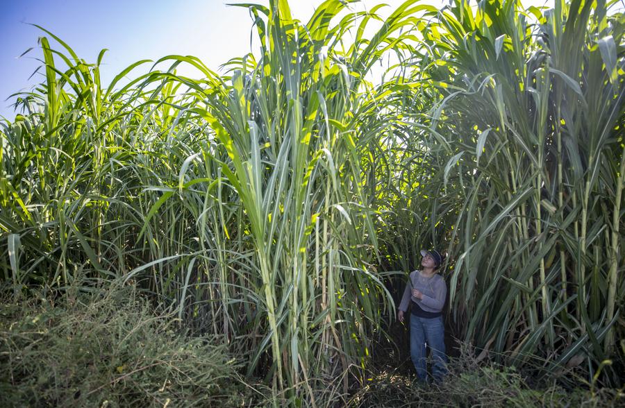 A staff member checks Juncao grass growing on the improved saline-alkali land in Qingtongxia City, northwest China's Ningxia Hui Autonomous Region, Sept. 23, 2024. (Xinhua/Yang Zhisen)