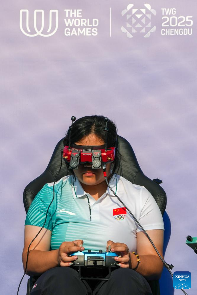 He Yutong of China competes during the Drone Sports Drone Racing at The World Games 2025 in Chengdu, southwest China's Sichuan Province, Aug. 15, 2025. (Xinhua/Li Bo)