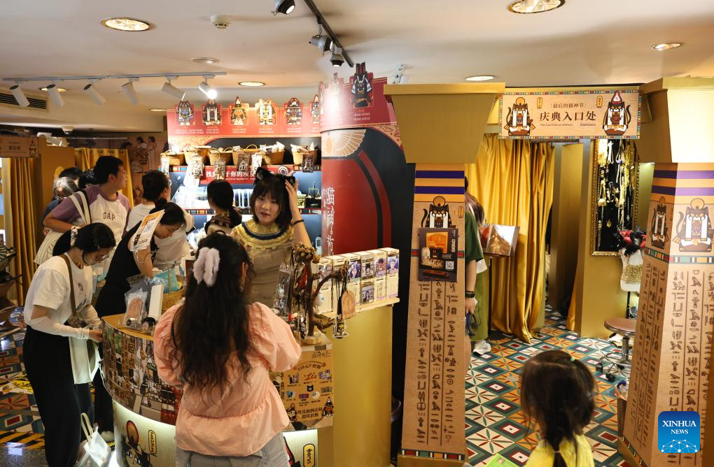 Visitors select cultural and creative products at Shanghai Museum in Shanghai, east China, Aug. 17, 2025. The exhibition titled "On Top of the Pyramid: The Civilization of Ancient Egypt", which had lasted for 13 months at Shanghai Museum since July 19, 2024, closed on Sunday here, receiving over 2.77 million visitors. (Xinhua/Fang Zhe)