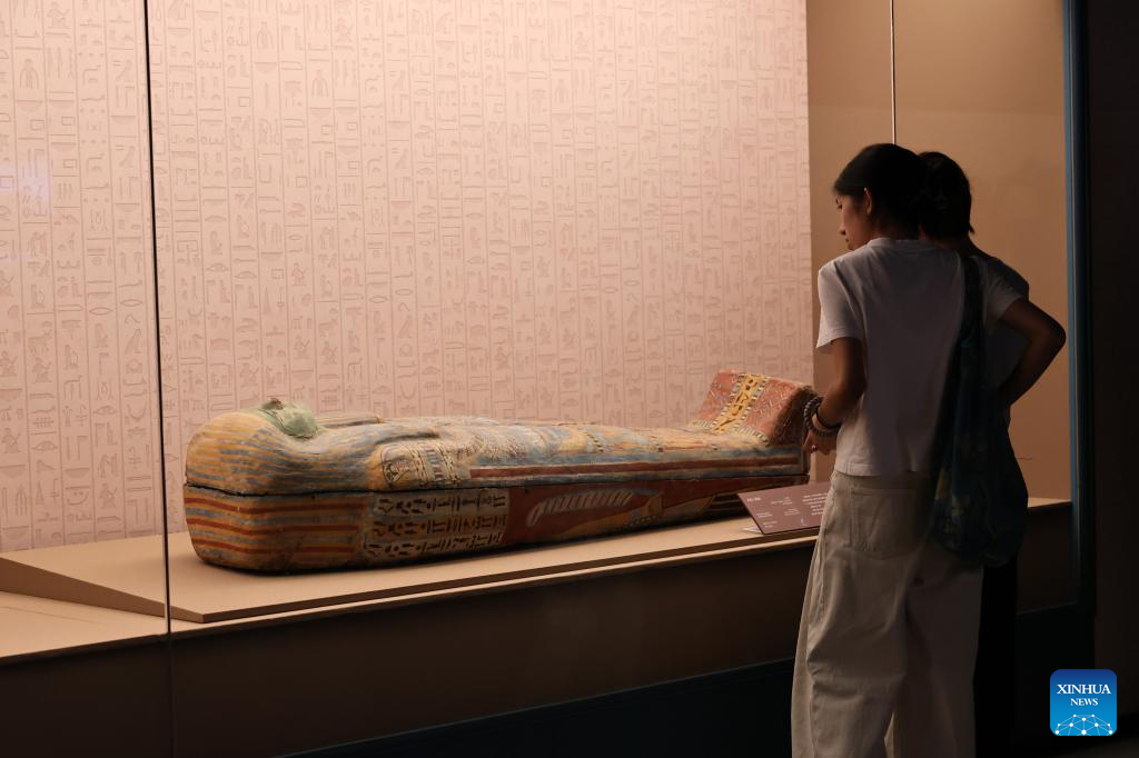 A visitor watches an exhibit at Shanghai Museum in Shanghai, east China, Aug. 17, 2025. The exhibition titled "On Top of the Pyramid: The Civilization of Ancient Egypt", which had lasted for 13 months at Shanghai Museum since July 19, 2024, closed on Sunday here, receiving over 2.77 million visitors. (Xinhua/Fang Zhe)