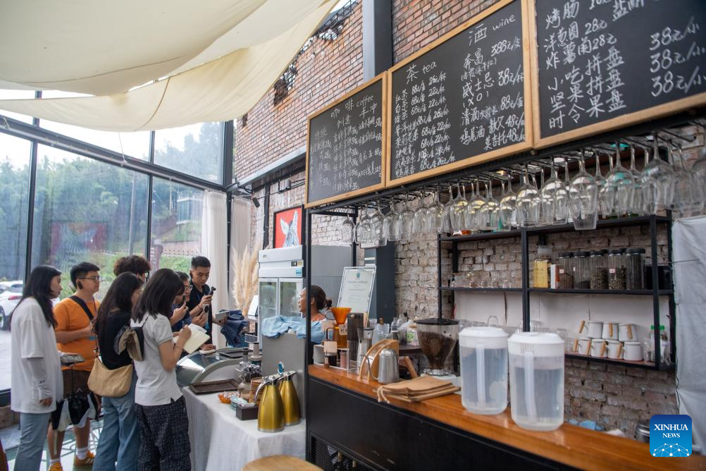 A staff member introduces coffee products to guests at a cafe converted from an obsolete mining facility at Lieshen Village in Zhushan Town, Liangping District of southwest China's Chongqing Municipality, Aug. 15, 2025. Lieshen Village, home to more than 8,000 mu (533 hectares) of forest, has actively transformed the obsolete mining zone there into environment-friendly businesses such as homestays, healthcare facilities and camping sites in pursuit of green development. (Xinhua/Tang Yi)