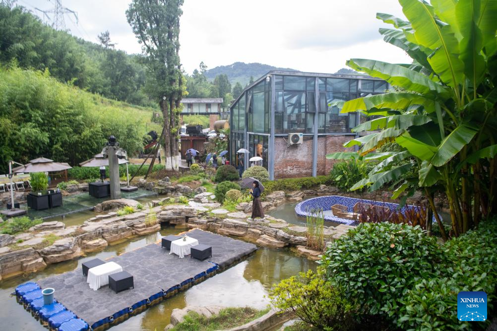 A staff member brews coffee at a cafe converted from a mining site at Lieshen Village in Zhushan Town, Liangping District of southwest China's Chongqing Municipality, Aug. 15, 2025. Lieshen Village, home to more than 8,000 mu (533 hectares) of forest, has actively transformed the obsolete mining zone there into environment-friendly businesses such as homestays, healthcare facilities and camping sites in pursuit of green development. (Xinhua/Tang Yi)