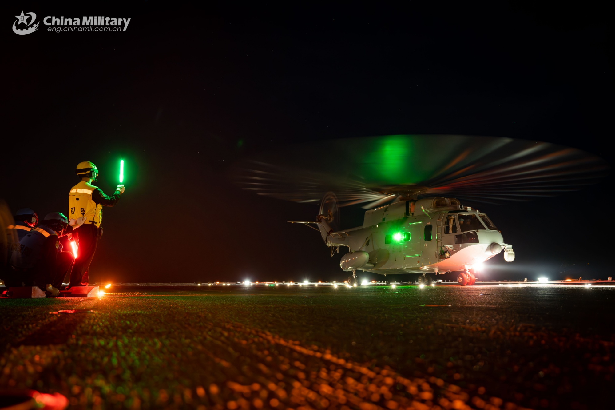 A crew member assigned to a detachment under the Chinese PLA Navy signals a ship-borne helicopter during a nighttime takeoff and landing training exercise. (eng.chinamil.com.cn/Photo by Sun Xitao)