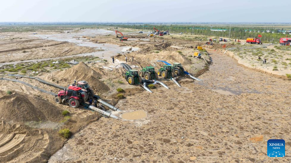 This photo taken on Aug. 18, 2025 shows the rescue site for missing individuals from a flash flood in Urad Rear Banner of Bayannur City, north China's Inner Mongolia Autonomous Region. The death toll from a flash flood that swept through a wild camping site in north China's Inner Mongolia Autonomous Region has risen to ten, with two people still missing, local emergency authorities said on Sunday.