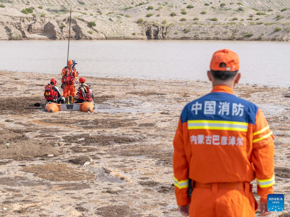 Firefighters search for missing individuals in Urad Rear Banner of Bayannur City, north China's Inner Mongolia Autonomous Region on Aug. 18, 2025. The death toll from a flash flood that swept through a wild camping site in north China's Inner Mongolia Autonomous Region has risen to ten, with two people still missing, local emergency authorities said on Sunday.