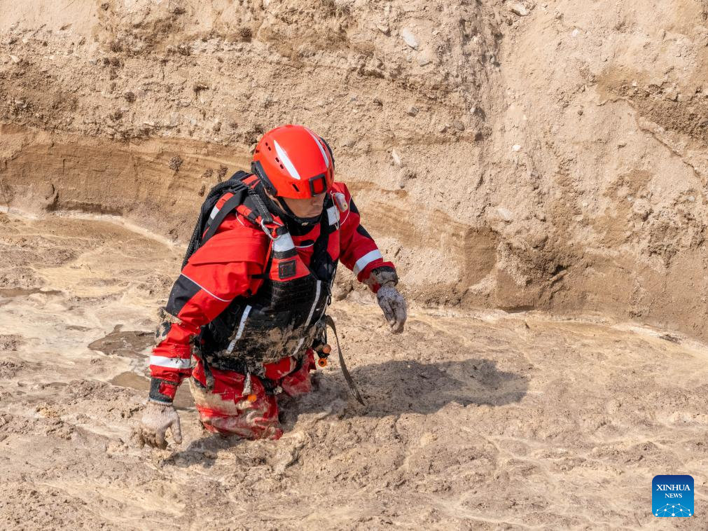 A firefighter searches for missing individuals in Urad Rear Banner of Bayannur City, north China's Inner Mongolia Autonomous Region on Aug. 18, 2025. The death toll from a flash flood that swept through a wild camping site in north China's Inner Mongolia Autonomous Region has risen to ten, with two people still missing, local emergency authorities said on Sunday.