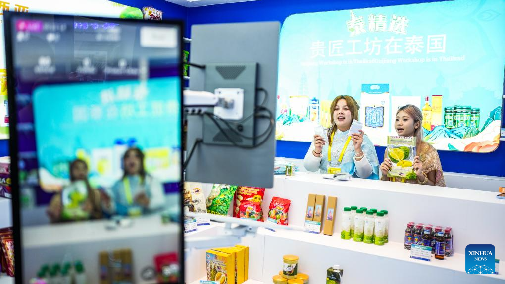 International students promote products via live-streaming at a cross-border e-commerce exhibition area during the 2025 China-ASEAN Education Cooperation Week in Gui'an New Area, southwest China's Guizhou Province, July 26, 2025. (Xinhua/Tao Liang)