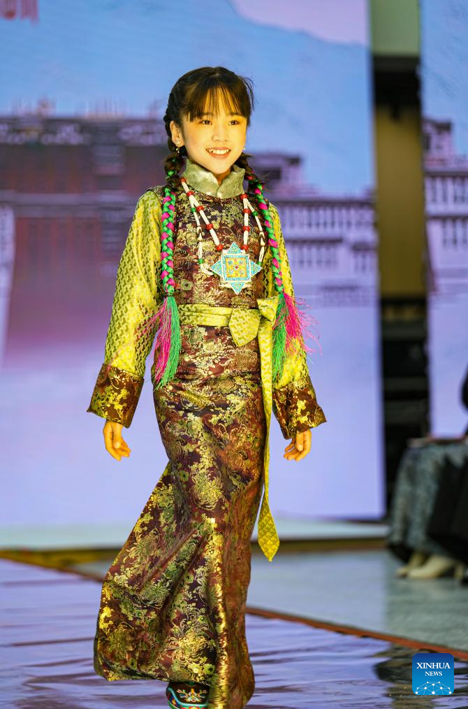 This photo taken on Jan. 5, 2025 shows children presenting costumes during a fashion culture week in Lhasa, southwest China's Xizang Autonomous Region. Traditional Tibetan costumes, after centuries of evolution and development, have formed rich styles and unique features. (Xinhua/Jigme Dorje)