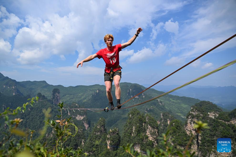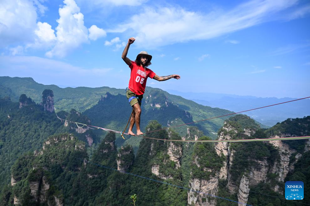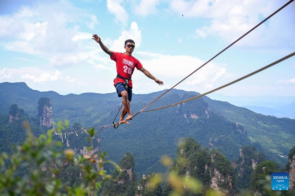 This photo taken on Aug. 18, 2025 shows He Jinyi of China competing during the 2025 "Slackline King" Championship at Huangshizhai scenic spot in Zhangjiajie, central China's Hunan Province. Some 20 elite slackline athletes from China, France, Brazil, and other countries and regions competed in the event. (Photo by Guo Liliang/Xinhua)