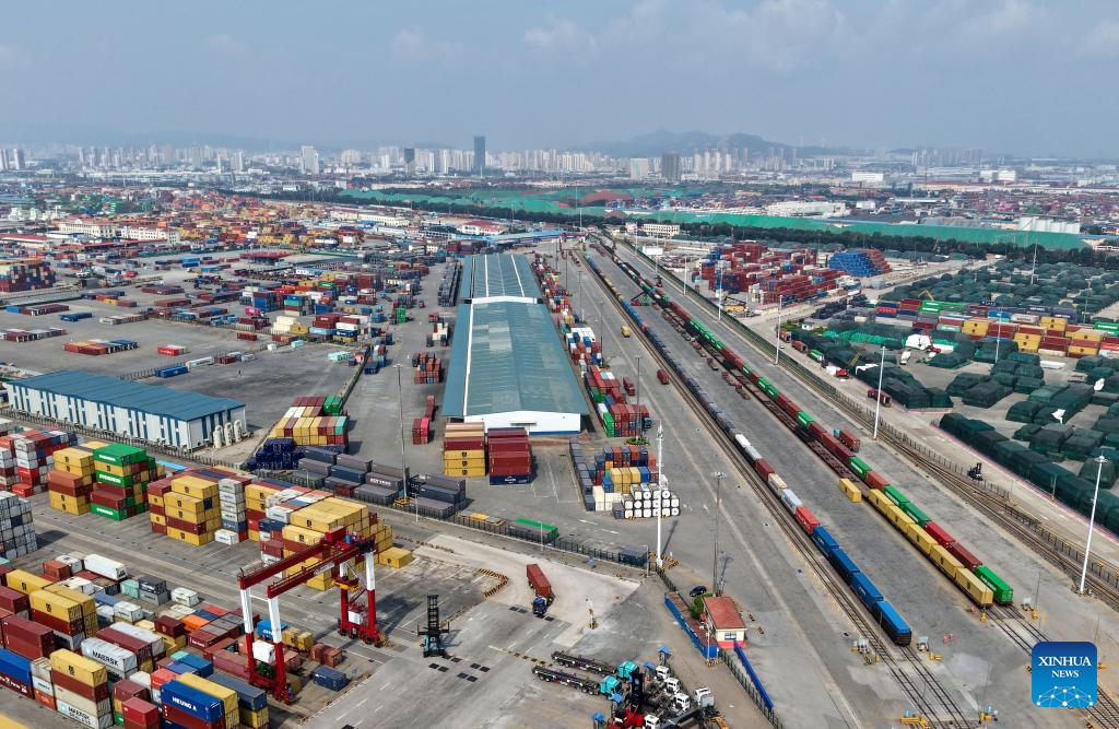An aerial drone photo taken on Aug. 19, 2025 shows a freight train leaving Qingdao Port in Qingdao, east China's Shandong Province. As of the end of July, Qingdao Port has added 22 new outbound trade routes this year, bringing its total to 233 and connecting to over 700 ports in more than 180 countries and regions. (Xinhua/Li Ziheng)